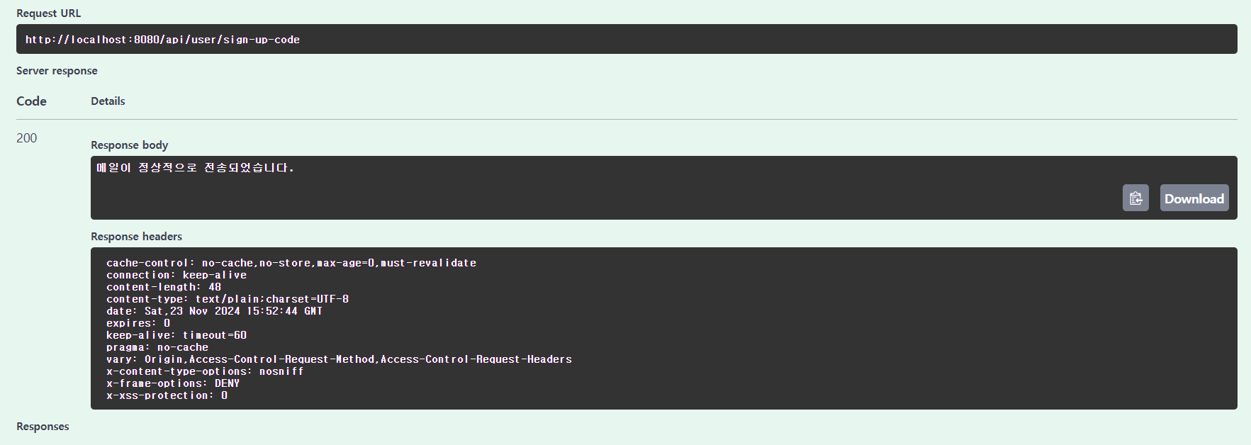 Swagger를 확인해보았을 때 200 Code가 떴고, 메일함에도 메일이 잘 와 있는 걸 확인할 수 있었다.