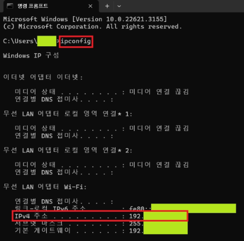 ipconfig를 입력한 후 엔터를 누른다. (맥OS는 ifconfig) - IPv4 주소라고 되어 있는 네 자리로 구성된 숫자가 내부IP이다.