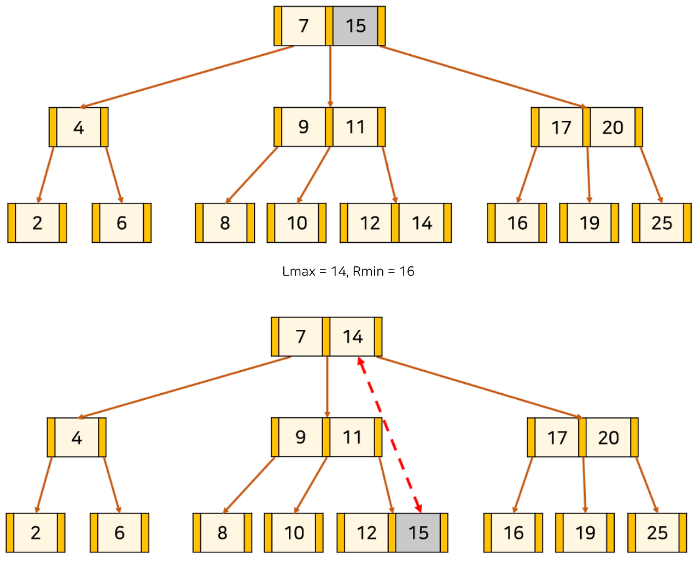 리프노드가 아닌 노드에 key가 중복해서 존재함. 해당 key를 노드보다 오른쪽에 있으면서 가장 작은 값으로 바꿔줘야 함