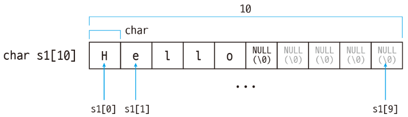 하지만, 문자열을 저장할 배열을 선언한다면 Hello 다섯 글자에 NULL 하나를 더해 6 이상이어야 한다.