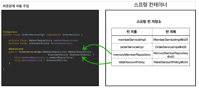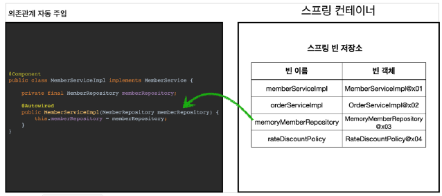 생성자가 @Autowired나 @RequiredArgsConstructor를 지정하면, 스프링 컨테이너가 자동으로 해당 스프링 빈을 찾아서 주입한다.