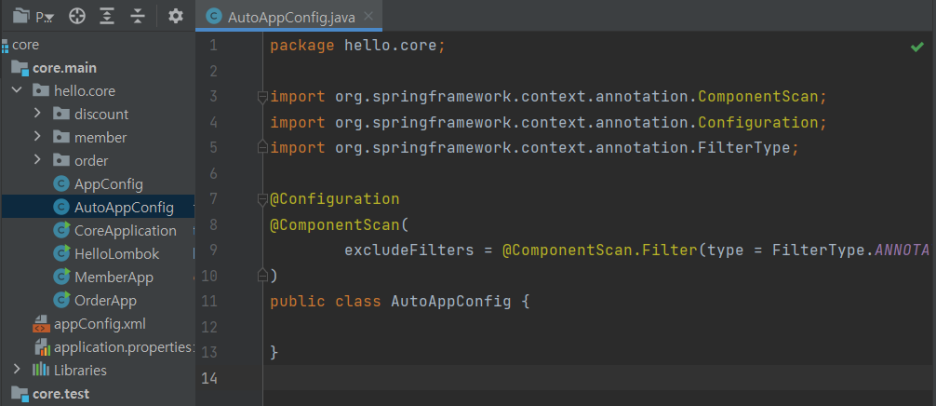최상단 패키지인 hello.core 안에 AutoConfig와 같은 메인 설정 정보를 두고, @ComponentScan 어노테이션을 붙인다.