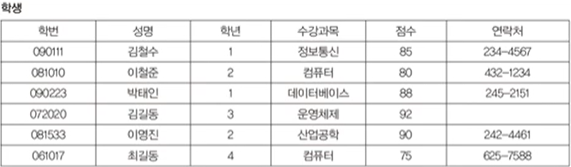| 학번 | 성명 | 주민등록번호 | 전공 | 학년 |