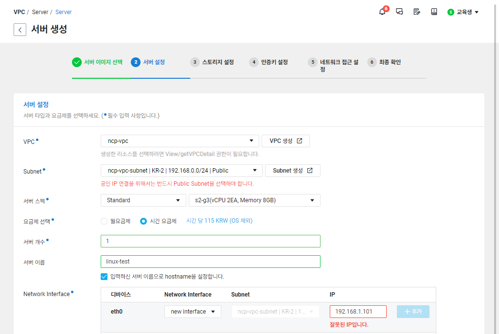 아래 사진처럼 Network Interface의 IP를 입력하려고 했더니 잘못된 IP입니다.라는 문구가 떴다.
