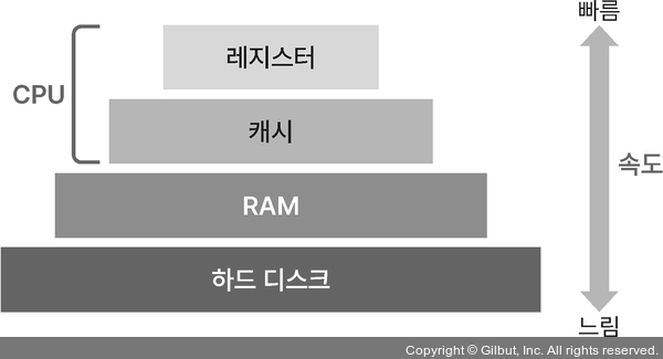 메모리는 CPU에서 빨리 접근할 수 있도록 아래와 같이 계층 구조로 나뉜다.